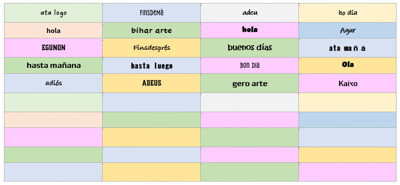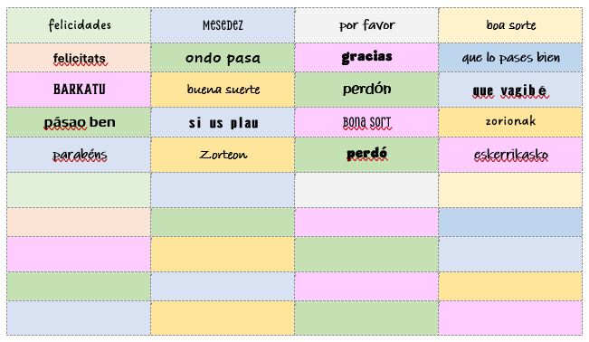 A medida que vayamos aprendiendo palabras nuevas en distintas lenguas, iremos completando la tabla.